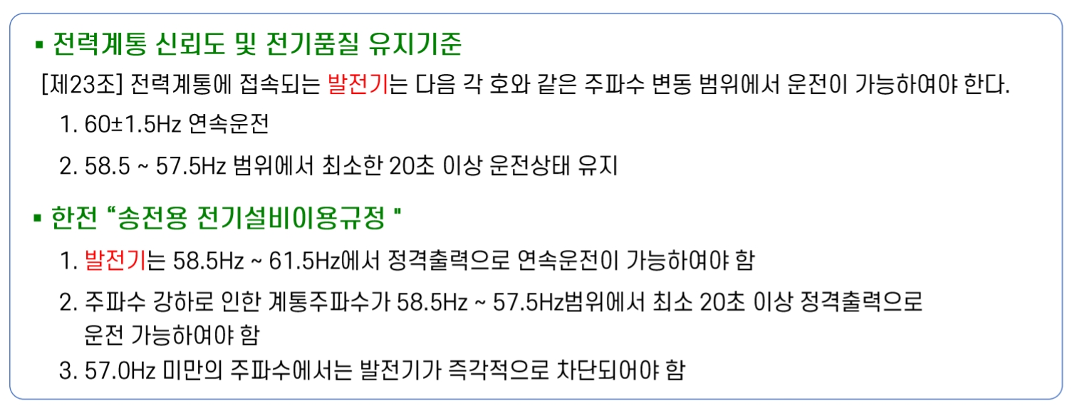 - 전력계통 신뢰도 및 전기품질 유지기준을 보면, ±1.5Hz까지는 연속운전을 해야 한다고 되어 있다. 그리고 이보다도