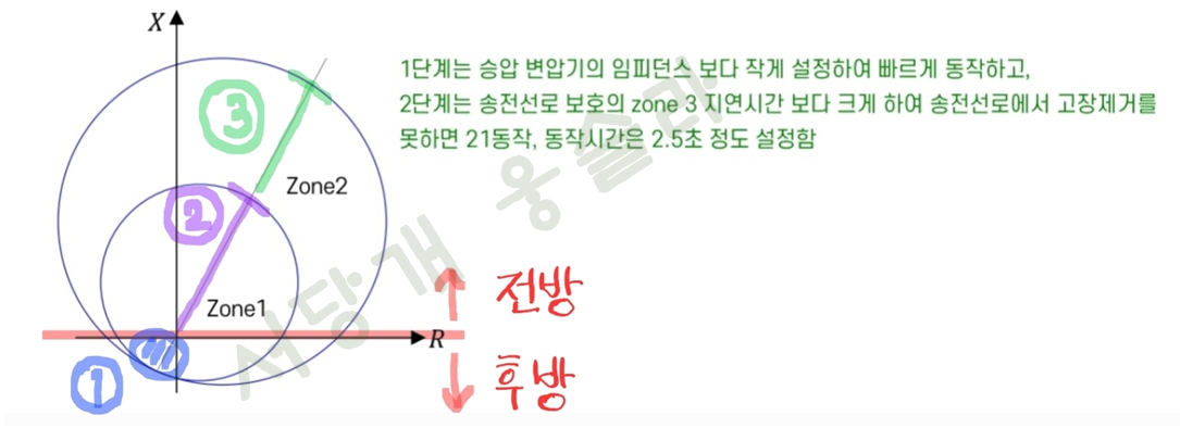 ③과 같이, 송전선로 보호용 거리계전기의 Zone3에서도 고장이 실패할 경우, 후비보호 되도록 발전기용 거리계전기의