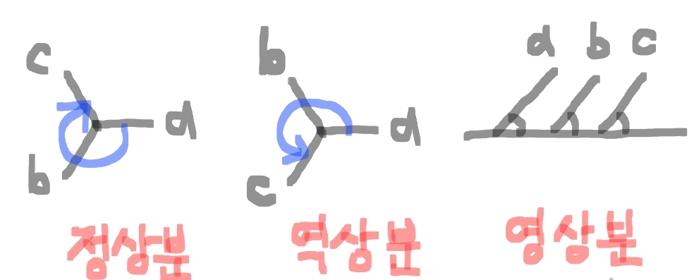 정상분과 역상분은 서로 위상차가 120˚ 차이가 나서 상회전하는 방향만 다를 뿐이지 서로 크기도 같기 때문에