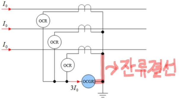 · 각 상에 OCR을 설치하고, 위 그림에서 잔류결선을 통해 OCGR이 영상전류를 검출해낸다.